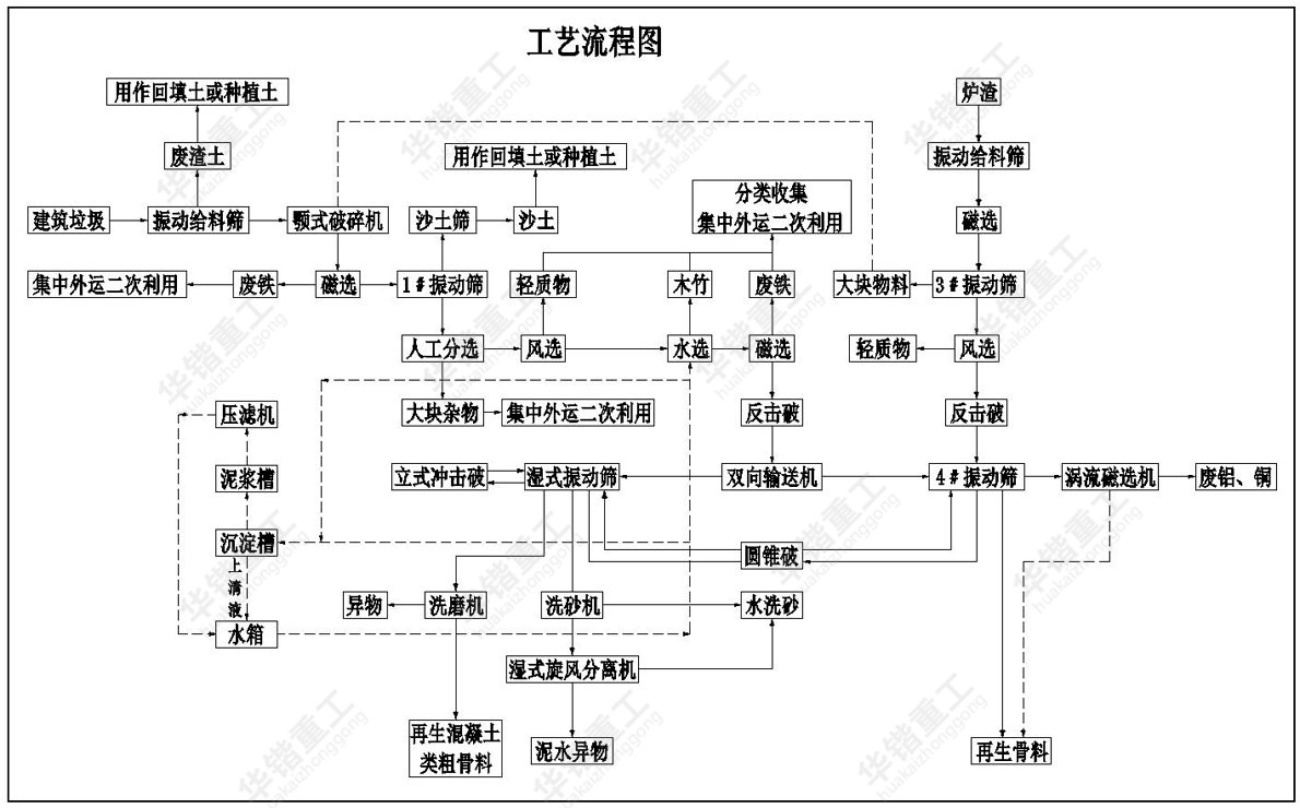 為積極響應(yīng)國家環(huán)保政策,改變建筑垃圾的處理現(xiàn)狀,提高資源再利用率,改善生態(tài)環(huán)境。我公司對建筑垃圾的處理方式進(jìn)行了深入研究,結(jié)合自身在破碎領(lǐng)域的技術(shù)支持,吸收國際先進(jìn)的建筑垃圾再生環(huán)保利用技術(shù),潛心研發(fā),現(xiàn)對建設(shè)垃圾資源化再利用提出兩種解決方案: